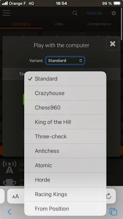 When creating a game against the computer, even if you are not registered, you have the choice between the following chess variants: